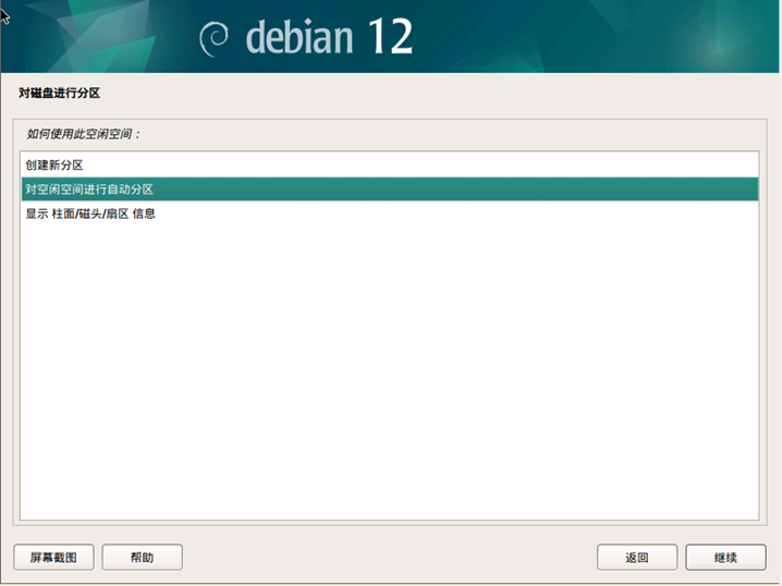 若对分区操作不熟或者没有特殊需求的可以选择“对空闲区间进行自动分区”来自动完成操作。这里 debian 系统预留了三种分区方案可供选择。